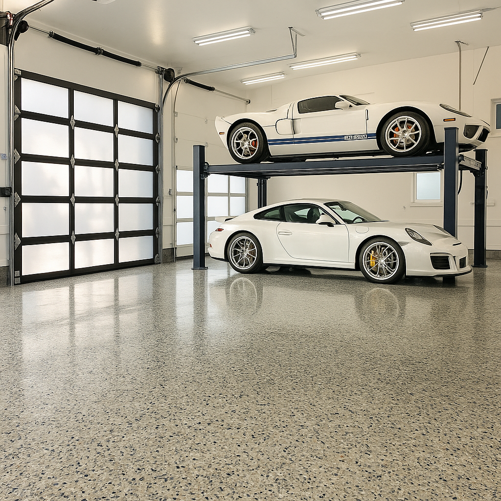 Transform your garage with a durable, stunning epoxy floor coating! Contact us today for the ultimate concrete makeover in NJ and NY. Choose our garage epoxy full flake system and give your floors the strength and beauty they deserve. Many epoxy floor flake color combination to choose from.